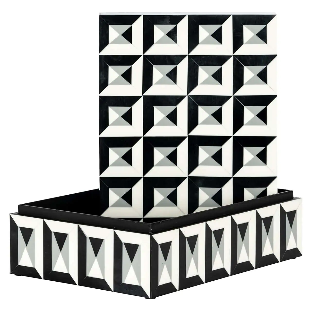 Κουτί κοσμημάτων, υπέροχης αισθητικής και ποιότητας σε ένα σύγχρονο άσπρο μαύρο μοτίβο Οι θήκες για τα κοσμήματα είναι αποσπώμενες και μπορούμε να το χρησιμοποιήσουμε σαν κουτί για την αποθήκευση διαφόρων πραγμάτων (όπως κλειδιά, καλλυντικά , κτλ), ή απλά σαν ένα διακοσμητικό κουτί στο coffee table ή σε οποιοδήποτε έπιπλο μας.